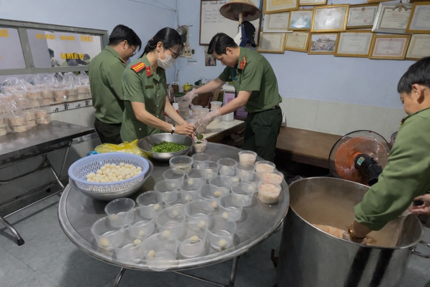 Cán bộ, chiến sĩ Phòng Tham mưu Công an thành phố Cần Thơ tất bật chuẩn bị các suất cháo nghĩa tình để trao tặng người bệnh.