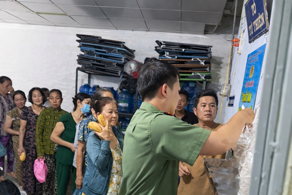Cán bộ, chiến sĩ Phòng Tham mưu Công an thành phố Cần Thơ trao các suất cháo miễn phí đến bệnh nhân và thân nhân nuôi bệnh.