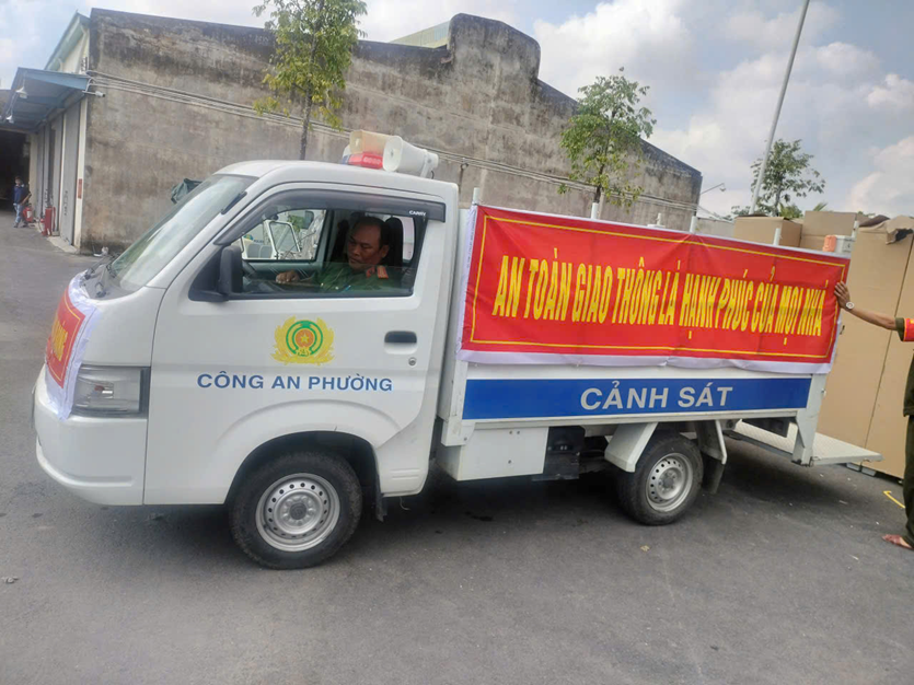 Xe tuần tra được treo băng rôn tuyên tuyền
