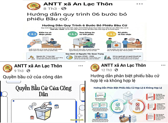 Chỉ tính riêng trong năm qua, Công an xã đã xây dựng hơn 100 sản phẩm truyền thông số như video, infographic, thu hút hàng chục nghìn lượt xem, chia sẻ và tương tác tích cực trên các nền tảng mạng xã hội. Đặc biệt, trong các đợt cao điểm tuyên truyền phục vụ bầu cử đại biểu Quốc hội khóa XVI và Hội đồng nhân dân các cấp nhiệm kỳ 2026 - 2031, đơn vị đã chủ động sản xuất nhiều video ngắn, hình ảnh trực quan về quyền, nghĩa vụ công dân, quy trình bầu cử và các hành vi bị nghiêm cấm; đồng thời kịp thời đấu tranh, phản bác thông tin sai lệch, xuyên tạc trên không gian mạng, góp phần bảo đảm các hoạt động diễn ra an toàn, đúng quy định.