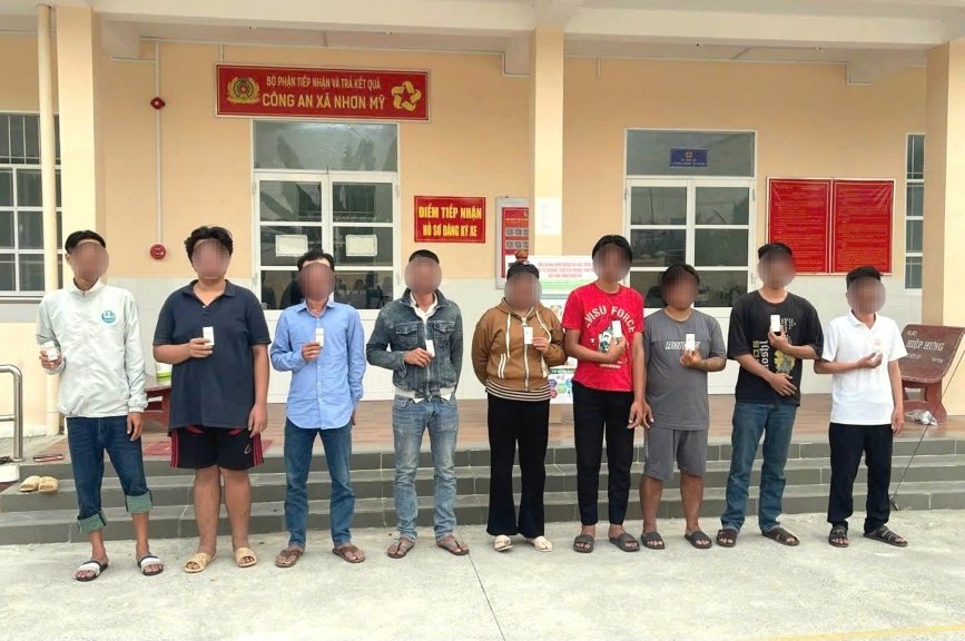 Công an xã Nhơn Mỹ kiểm tra nhanh nhóm người ở ấp Phụng An và ấp Phú Tây, tất cả đều dương tính với chất ma túy.