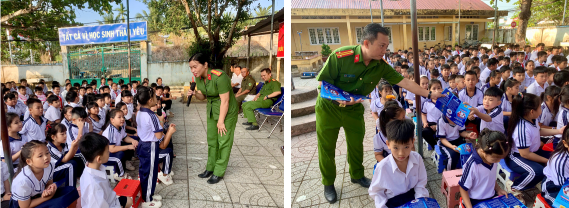 Công an xã Phụng Hiệp tuyên truyền phòng, chống ma túy, bảo đảm trật tự, an toàn giao thông và trao quà cho “Con nuôi đỡ đầu” tại Trường Tiểu học Hòa Mỹ 3