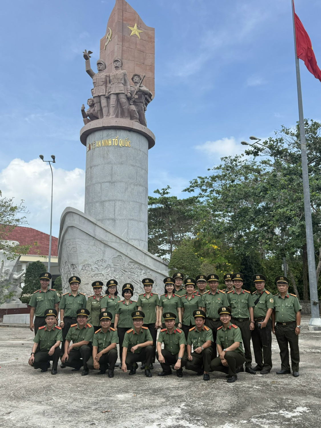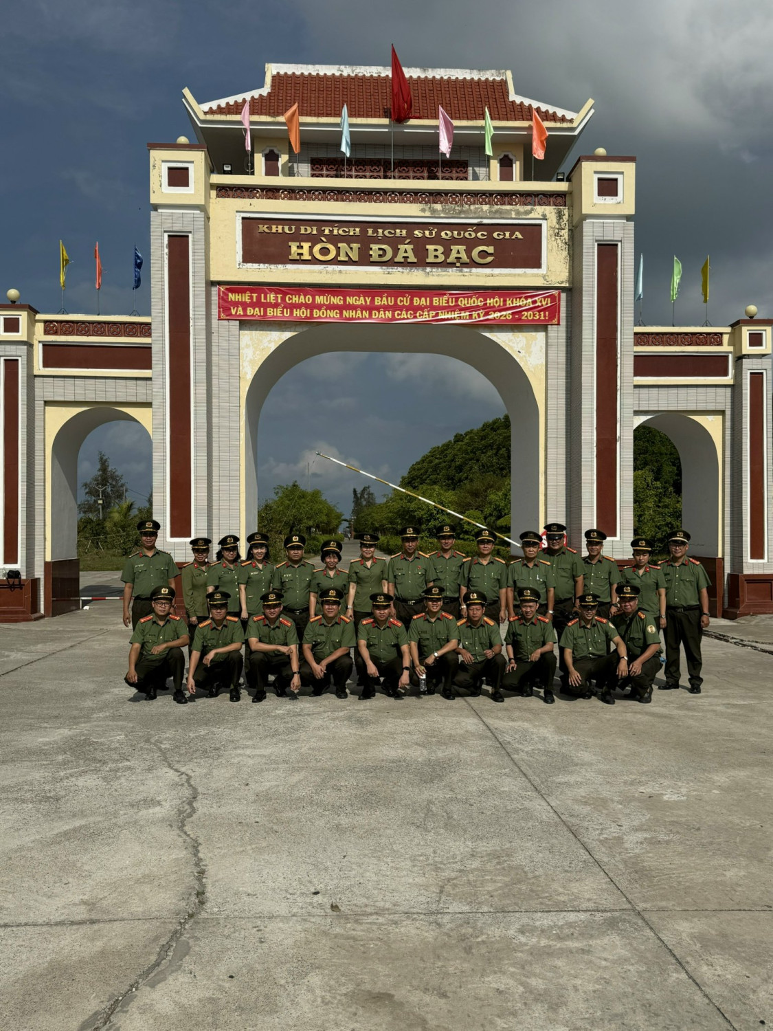 Cụm thi đua An ninh nhân dân, Công an thành phố Cần Thơ chụp ảnh lưu niệm tại cổng và Tượng đài bảo vệ an ninh Tổ quốc trong khuôn viên Khu di tích lịch sử quốc gia Hòn Đá Bạc, ấp Kinh Hòn, xã Đá Bạc, tỉnh Cà Mau