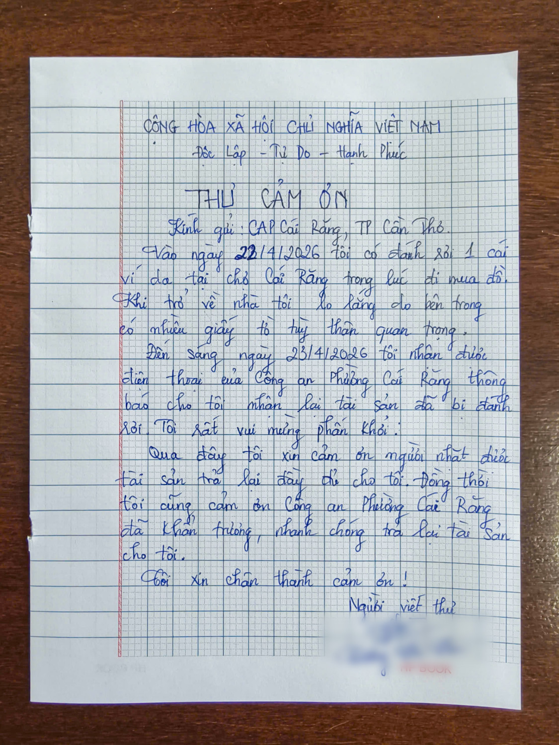 Ngày 23/4/2026, Công an phường Cái Răng đã kịp thời hỗ trợ trao trả tài sản bị đánh rơi cho người dân, qua đó góp phần lan tỏa hành động đẹp, cụ thể hóa việc thực hiện phong trào thi đua “Ba nhất: Kỷ luật nhất - Trung thành nhất - Gần dân nhất” trong lực lượng Công an nhân dân.