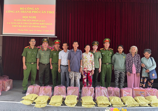 Thiết thực triển khai các hoạt động hưởng ứng phong trào thi đua Ba nhất “Kỷ luật nhất – Trung thành nhất – Gần dân nhất”, đẩy mạnh công tác tuyên truyền, phổ biến pháp luật và chung tay chăm lo đời sống Nhân dân, ngày 26/12/2025, Phòng Hậu cần phối hợp với các Phòng Nghiệp vụ Công an thành phố và Công an xã Phong Điền tổ chức chương trình tuyên truyền pháp luật, phòng, chống tội phạm và tặng quà cho các gia đình có hoàn cảnh khó khăn trên địa bàn xã Phong Điền, thành phố Cần Thơ