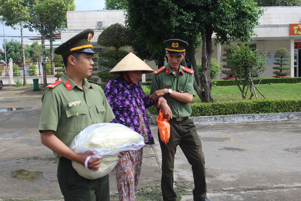 Cán bộ chiến sĩ Phòng Hậu cần hỗ trợ người dân nhận quà