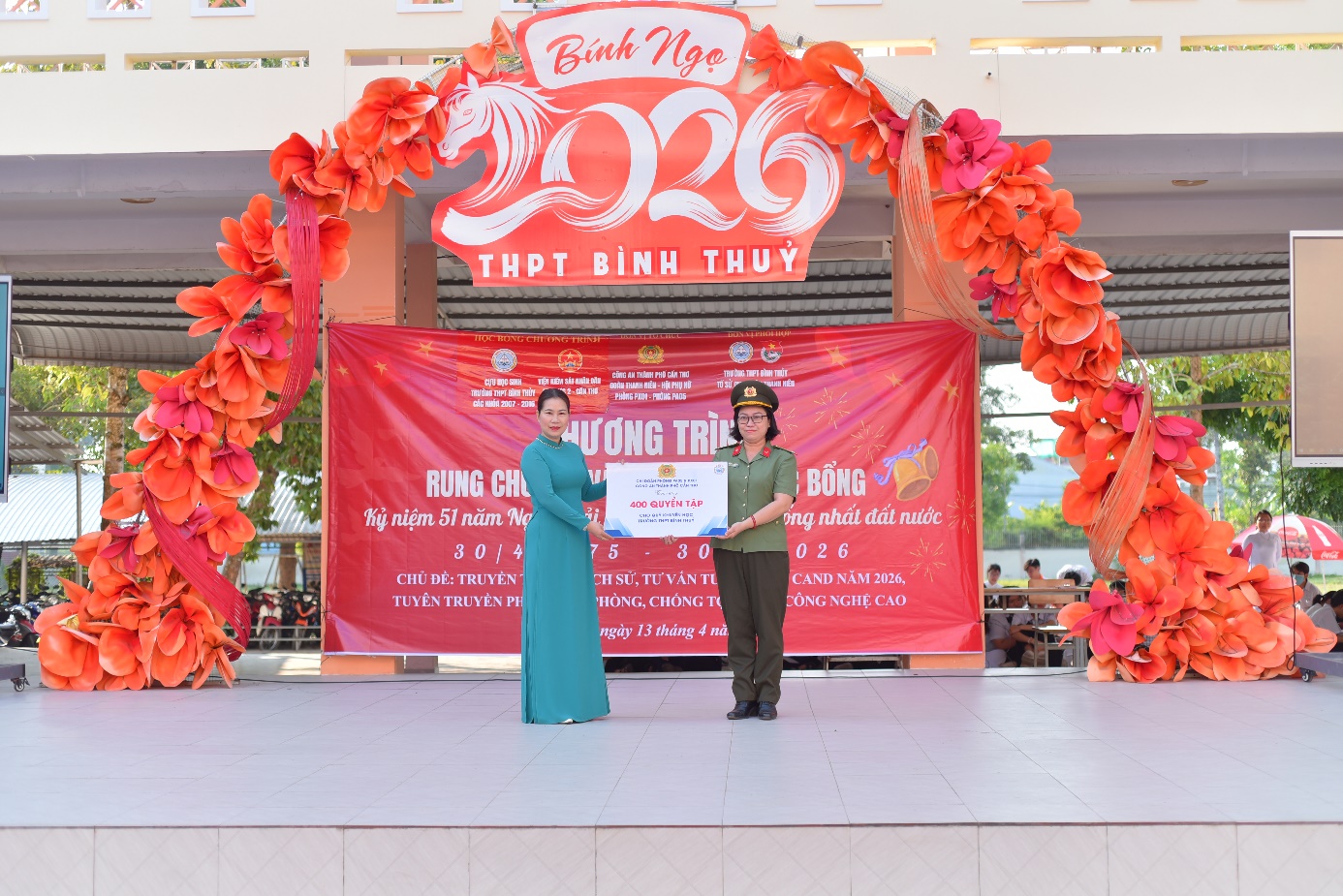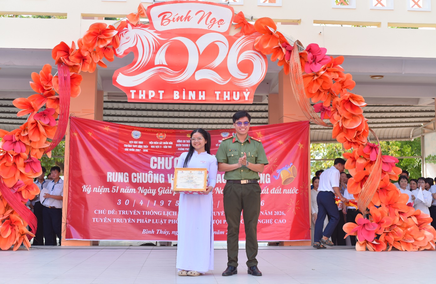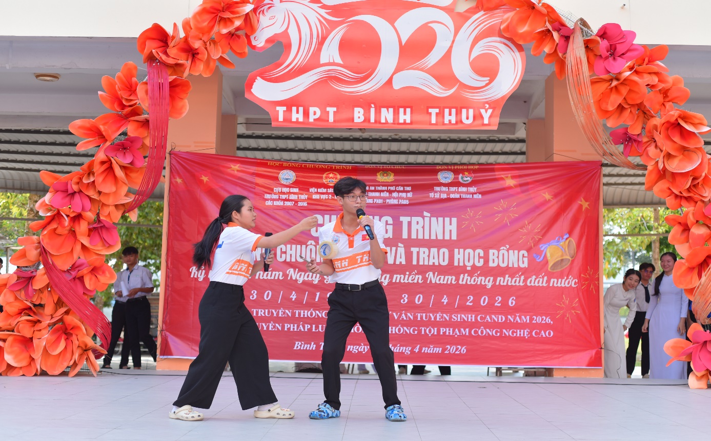 Trong không khí hào hùng của những ngày tháng Tư lịch sử, hướng tới kỷ niệm 51 năm Ngày Giải phóng miền Nam, thống nhất đất nước (30/4/1975 – 30/4/2026) và Giỗ Tổ Hùng Vương, sáng ngày 13/4/2026, Chi đoàn - Hội Phụ nữ Phòng Tổ chức Cán bộ (Phòng PX01) và Phòng An ninh mạng và phòng, chống tội phạm sử dụng công nghệ cao (Phòng PA05), Công an thành phố Cần Thơ đã tổ chức chuỗi hoạt động đầy ý nghĩa tại trường THPT Bình Thủy và Đền thơ các vua Hùng với sự tham gia của Chi đoàn Viện Kiểm sát nhân dân Khu vực 1, 2 - TP. Cần Thơ, quý thầy cô cùng hơn 1900 em học sinh nhà trường. Đây là hoạt động cụ thể hóa mạnh mẽ phong trào thi đua “Ba nhất” (Kỷ luật nhất - Trung thành nhất - Gần dân nhất) gắn với mô hình dân vận khéo “Tuyên truyền phòng, chống chống tội phạm sử dụng công nghệ cao trên địa bàn thành phố Cần Thơ” của Phòng PA05.