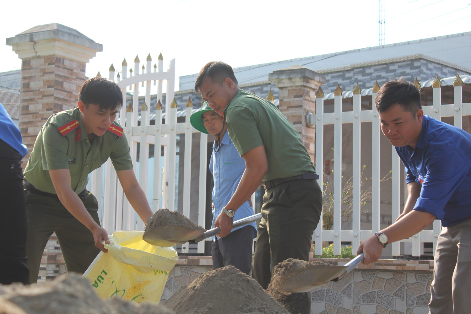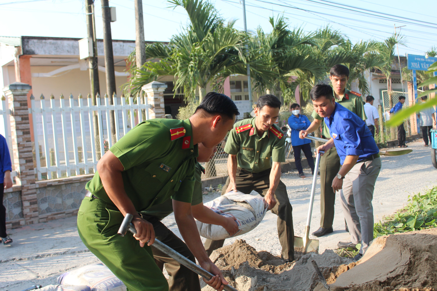 Cán bộ, chiến sĩ ra quân dọn dẹp, sửa chữa đường giao thông nông thôn tại ấp Đông Thắng, xã Đông Thuậ