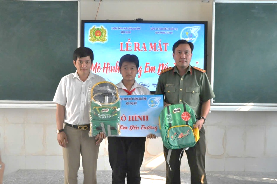Đồng chí Thượng tá Trần Nguyễn Hòa Thơ, Trường Phòng Tham mưu tặng quà học sinh được nhận đỡ đầu tại Lễ ra mắt mô hình