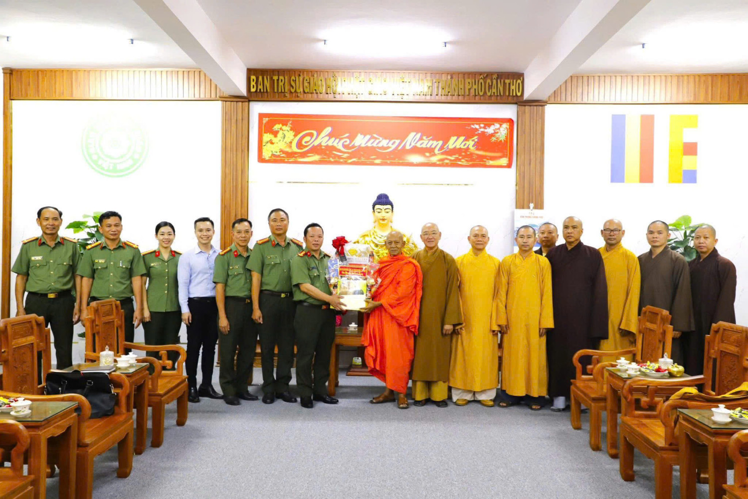Đồng chí Thượng tá Đồng Quang Quân, Phó Trưởng Phòng Tham mưu, Công an Công an thành phố Cần Thơ tham gia cùng đoàn công tác của đồng chí Đại tá Nguyễn Văn Thắng, Ủy viên Ban Thường vụ Đảng ủy, Phó Giám đốc Công an thành phố thăm, chúc mừng Tết Chol Chnăm Thmây năm 2026 tại Ban Trị sự GHPGVN thành phố Cần Thơ
