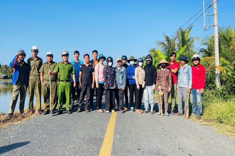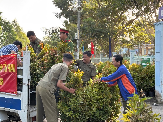 Lực lượng Công an xã Hồ Đắc Kiện phối hợp với các lực lượng chuẩn bị trồng cây trên tuyến Huyện lộ 92.