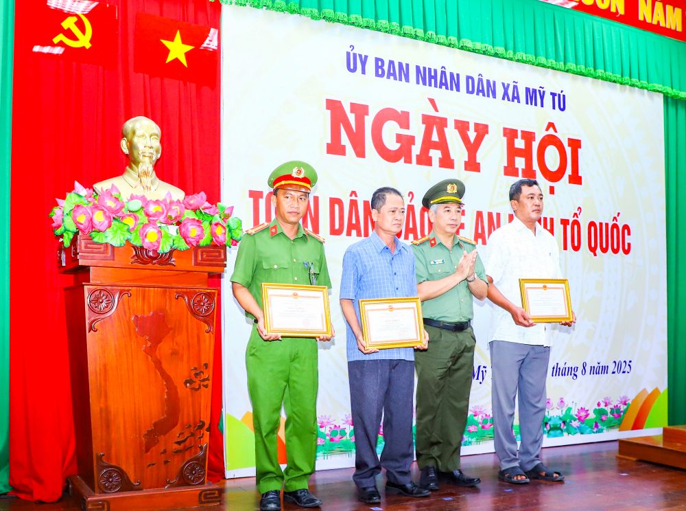 Ảnh: Đại tá Huỳnh Hoài Hận, Phó Giám đốc Công an thành phố Cần Thơ trao khen thưởng cho các tập thể, cá nhân có thành tích xuất sắc trong phong trào toàn dân bảo vệ an ninh Tổ quốc nhân dịp Ngày hội năm 2025.
