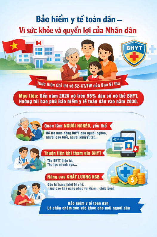 Nhằm tiếp tục tăng cường sự lãnh đạo của Đảng, nâng cao hiệu quả thực hiện chính sách BHYT trong bối cảnh mới, Ban Bí thư Trung ương Đảng đã ban hành Chỉ thị số 52-CT/TW về thực hiện bảo hiểm y tế toàn dân trong giai đoạn mới. Chỉ thị xác định rõ mục tiêu đến năm 2026, tỷ lệ người dân có thẻ BHYT đạt trên 95% và hướng tới bao phủ bảo hiểm y tế toàn dân vào năm 2030, qua đó khẳng định quyết tâm chính trị cao trong việc bảo đảm quyền được chăm sóc sức khỏe của Nhân dân.