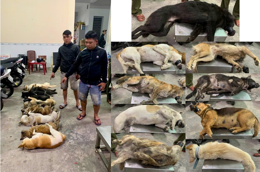 Hai đối tượng Nguyễn Văn Vũ và Phạm Minh Hậu cùng số chó tang vật