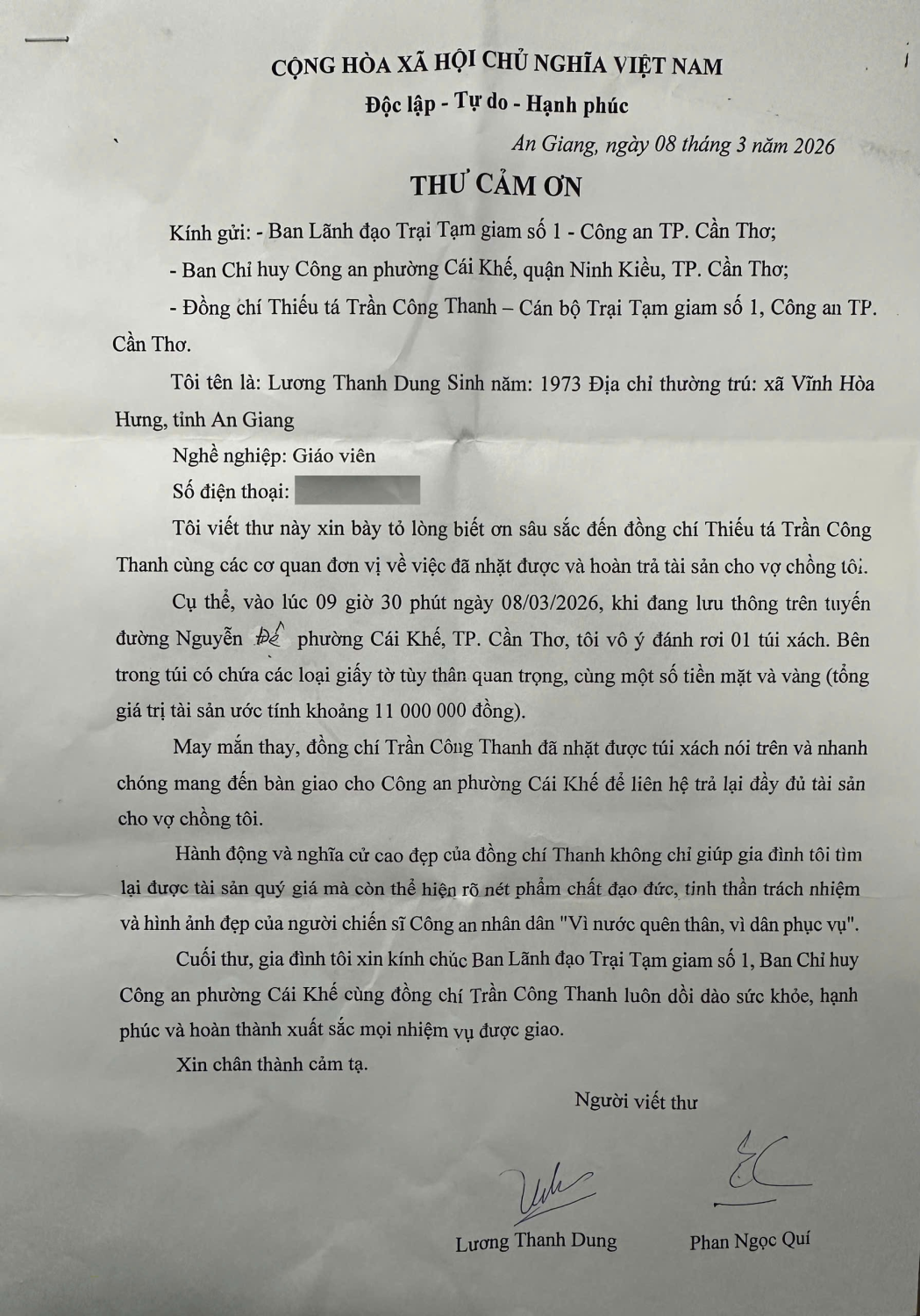 Khi nhận lại giấy tờ và tài sản tưởng chừng đã bị thất lạc, chị Lương Thanh Dung và gia đình vô cùng xúc động. Chị cho biết bản thân và chồng rất vui mừng khi được nhận lại đầy đủ tài sản cùng nhiều giấy tờ quan trọng bị đánh rơi trước đó. Trong thư cảm ơn gửi Ban lãnh đạo Trại Tạm giam số 1, Công an phường Cái Khế và cá nhân Thiếu tá Trần Công Thanh, chị Lương Thanh Dung bày tỏ: “Hành động và nghĩa cử cao đẹp của đồng chí Thanh không chỉ giúp gia đình tôi tìm lại được tài sản quý giá mà còn thể hiện rõ phẩm chất đạo đức, tinh thần trách nhiệm và hình ảnh đẹp của người chiến sĩ Công an nhân dân ‘Vì nước quên thân, vì dân phục vụ’.”