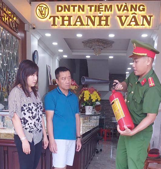 Công an phường Vị Thanh hướng dẫn sử dụng bình chữa cháy xách tay cho các hộ kinh doanh