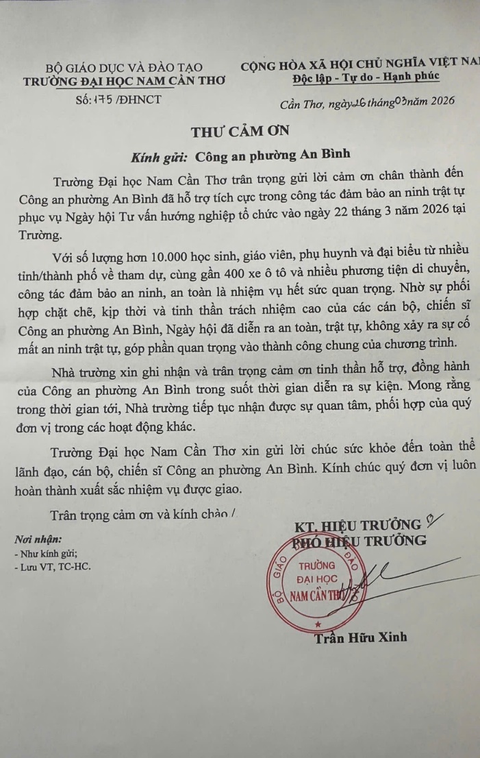 Ghi nhận những kết quả đạt được, Ban Giám hiệu Trường Đại học Nam Cần Thơ đã gửi thư cảm ơn, biểu dương tinh thần trách nhiệm, sự chủ động và hiệu quả phối hợp của Công an phường An Bình. Đây là nguồn động viên, khích lệ cán bộ, chiến sĩ tiếp tục nỗ lực, quyết tâm hoàn thành tốt mọi nhiệm vụ được giao, góp phần giữ vững an ninh, trật tự trên địa bàn./.