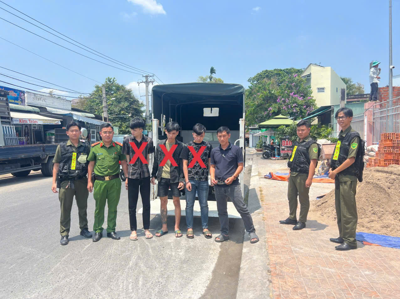 Lực lượng Công an phường Cái Khế làm việc với 03 đối tượng (đứng giữa) liên quan đến hành vi tổ chức sử dụng trái phép chất ma túy.