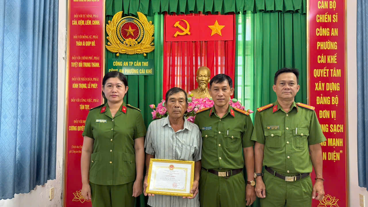 Ngày 24/4/2026, Công an phường Cái Khế đã trao Giấy khen của Chủ tịch Ủy ban nhân dân phường Cái Khế cho ông Lê Văn Sáng (sinh năm 1961, ĐKTT: Số 1/9, đường Mậu Thân, phường Cái Khế, thành phố Cần Thơ).