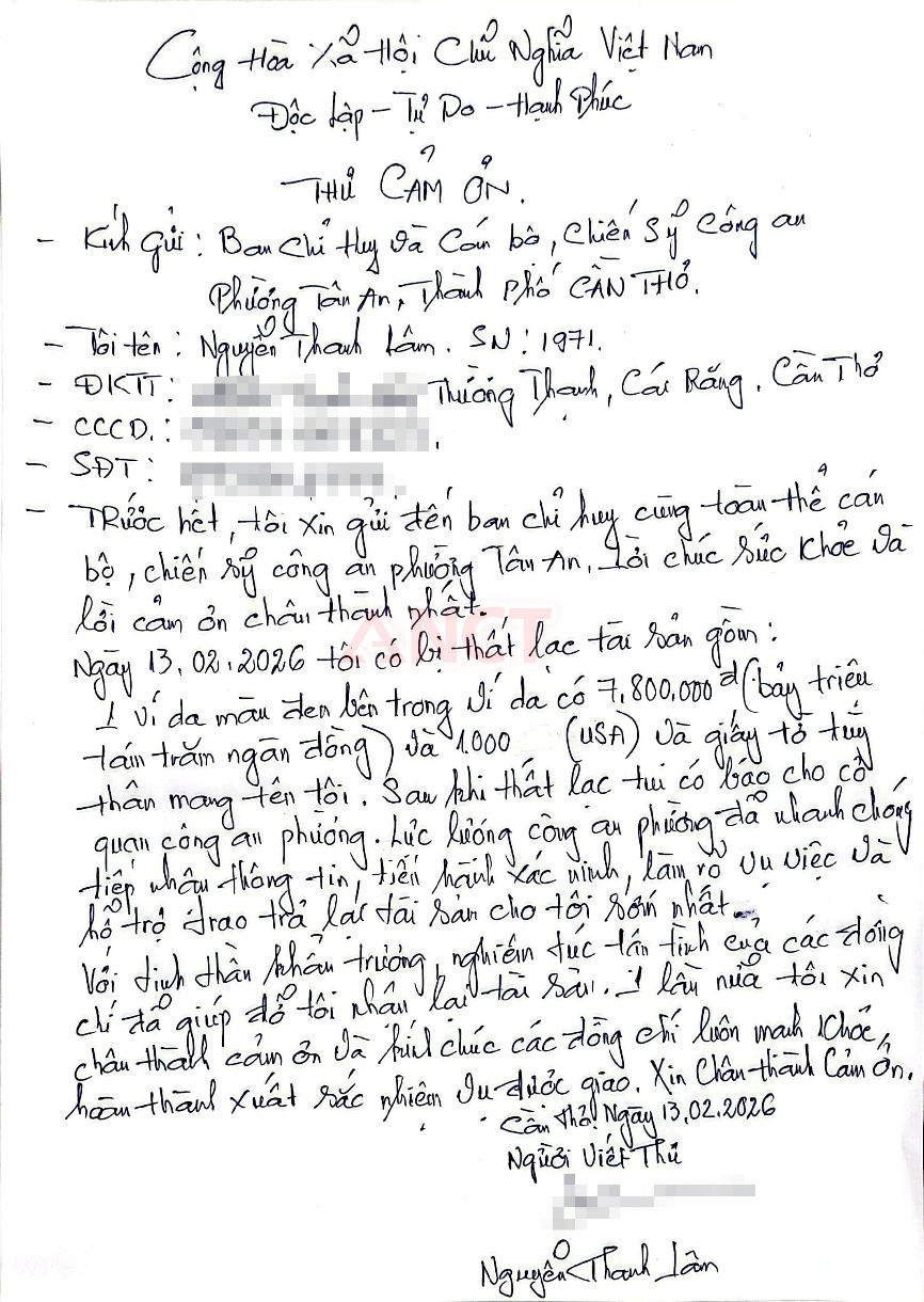 Kết quả xác minh cho thấy, tài sản bị đánh rơi gồm tiền mặt và ngoại tệ, cùng các giấy tờ tùy thân mang tên ông Nguyễn Thanh Lâm (sinh năm 1971, ngụ phường Thường Thạnh, quận Cái Răng, thành phố Cần Thơ). Toàn bộ tài sản sau đó đã được Công an phường Tân An trao trả lại cho ông Lâm trước sự chứng kiến của các bên liên quan. Việc xác minh, trao trả được thực hiện công khai, đúng trình tự, bảo đảm đầy đủ quyền lợi của người dân, qua đó hạn chế những rủi ro, phát sinh có thể xảy ra trong quá trình xử lý tài sản đánh rơi.