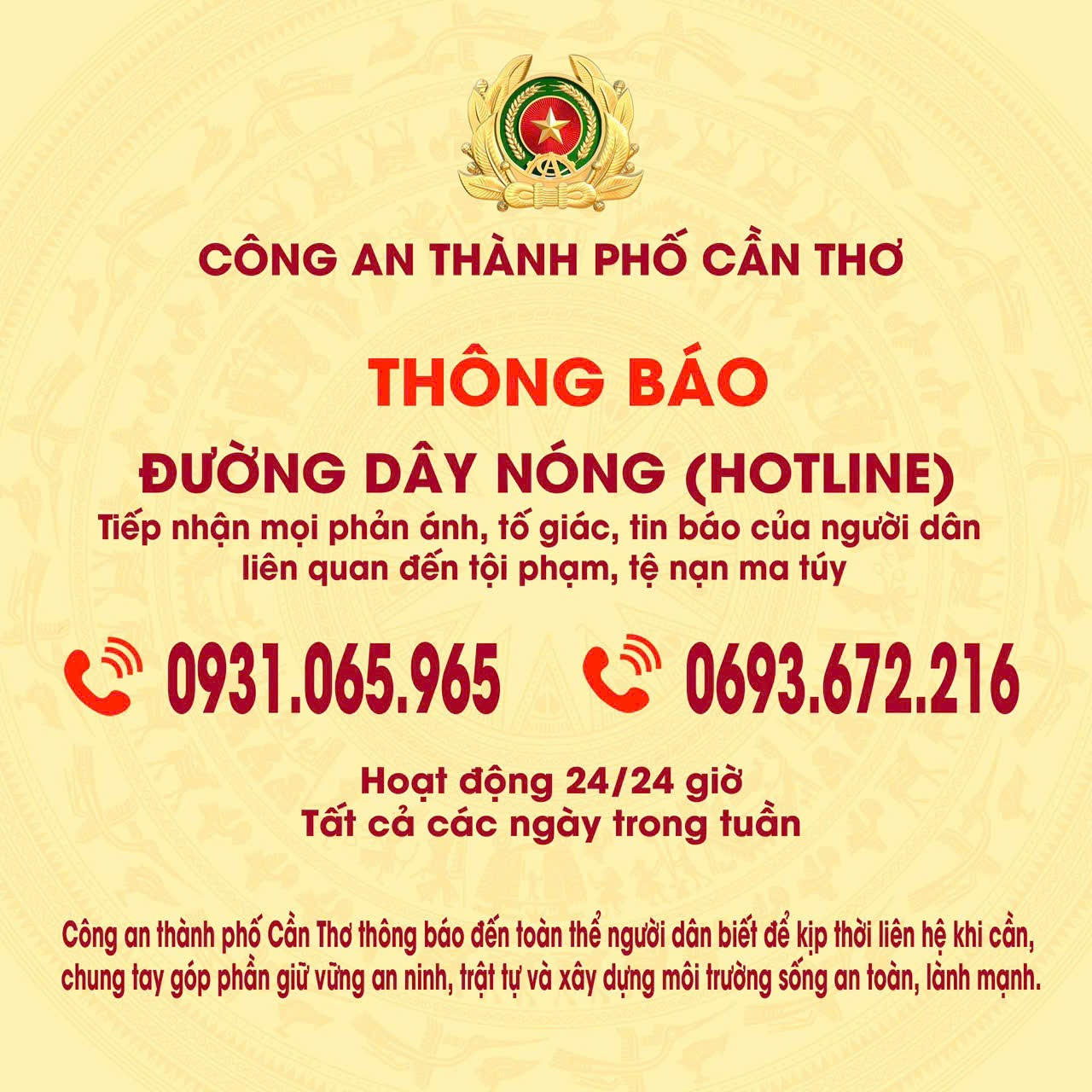 Để tăng cường hiệu quả đấu tranh phòng, chống tội phạm trên địa bàn thành phố Cần Thơ. Giám đốc Công an thành phố công khai số điện thoại đường dây nóng để kịp thời tiếp nhận mọi phản ánh, tố giác, tin báo của người dân liên quan đến tội phạm, tệ nạn ma túy như sau: