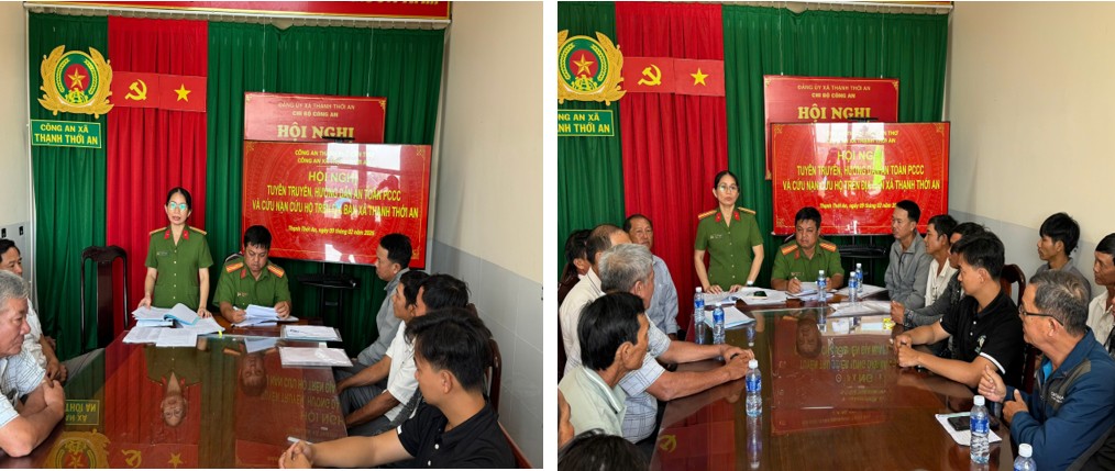 Thực hiện chỉ đạo của Công an thành phố Cần Thơ về tăng cường công tác bảo đảm an toàn phòng cháy, chữa cháy và cứu nạn, cứu hộ trong cao điểm Lễ, Tết năm 2026 và phục vụ các sự kiện chính trị quan trọng diễn ra trên địa bàn, ngày 09/02/2026, Công an xã Thạnh Thới An tổ chức Hội nghị tuyên truyền, hướng dẫn an toàn phòng cháy, chữa cháy và cứu nạn, cứu hộ cho 43 hộ kinh doanh trên địa bàn xã.