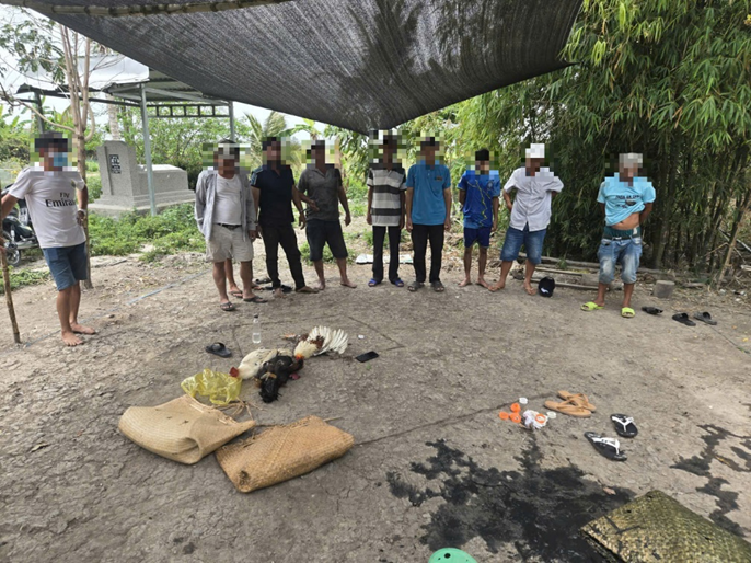 Tiếp đó, lúc 14 giờ 00 phút ngày 24/02/2026, đơn vị tiếp tục bắt quả tang 09 đối tượng tham gia đánh bạc dưới hình thức đá gà tại khu đất trống thuộc ấp 7, xã Vị Thủy. Tang vật thu giữ gồm 02 con gà đá, 02 bộ cựa sắt và hơn 22 triệu đồng.
