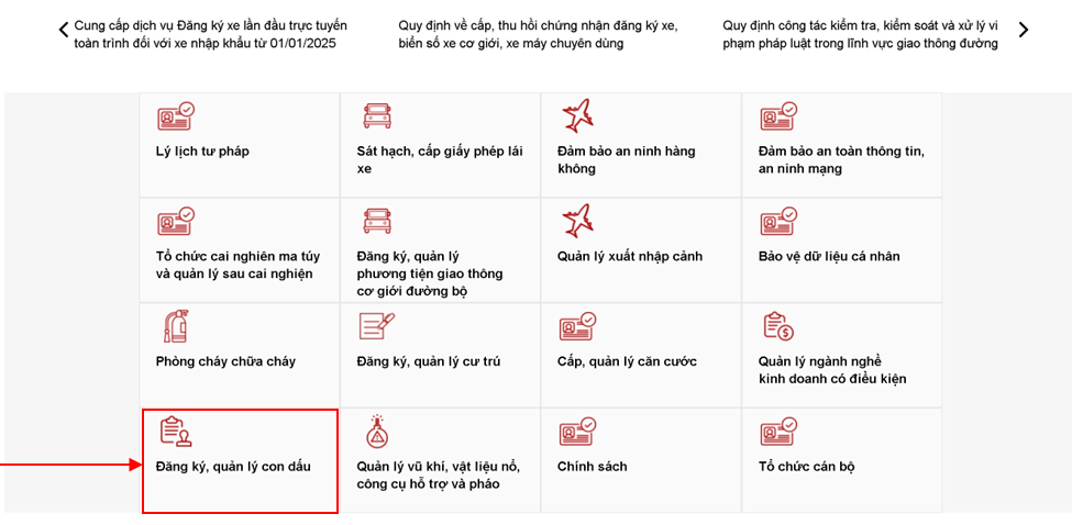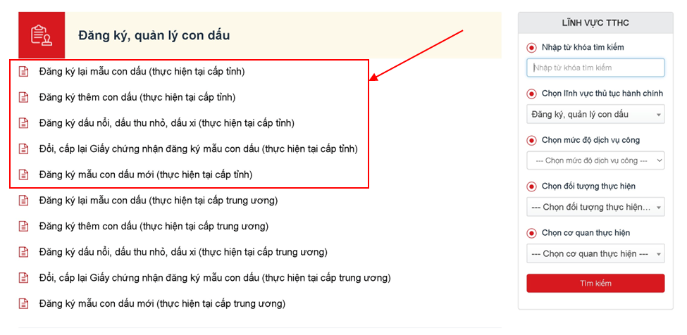- Bước 2: Chọn lĩnh vực Đăng ký, quản lý con dấu.
