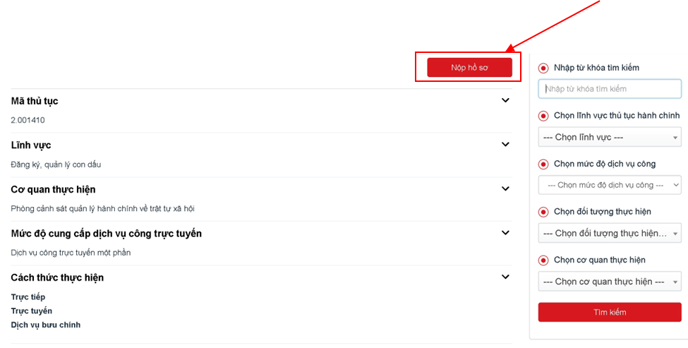 - Bước 3: Chọn 01 trong 05 thủ tục hành chính thực hiện tại cấp tỉnh: Đăng ký mẫu con dấu mới; Đăng ký lại mẫu con dấu; Đăng ký thêm con dấu; Đăng ký dấu nổi, dấu thu nhỏ, dấu xi; Đổi, cấp lại giấy chứng nhận đăng ký mẫu dấu. Tại đây, có thể đọc chi tiết các thông tin cần thiết để thực hiện nộp hồ sơ được đầy đủ, chính xác như cách thức thực hiện, trình tự thực hiện, các thủ tục có trong hồ sơ, phí, lệ phí,... Sau đó, chọn “Nộp hồ sơ”.