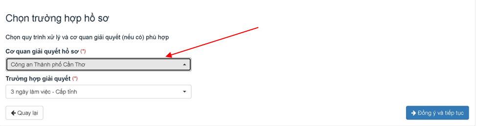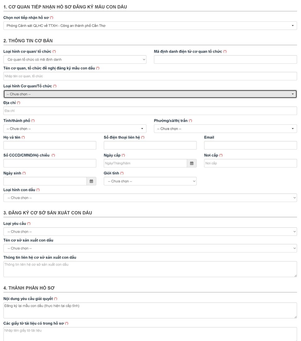 - Bước 4: Cung cấp thông tin: + Chọn nơi tiếp nhận hồ sơ: “Công an thành phố Cần Thơ”. + Điền đầy đủ các thông tin cơ bản (Mã định danh điện tử cơ quan, tổ chức; Tên cơ quan, tổ chức đề nghị đăng ký mẫu con dấu; Địa chỉ; Email;…). + Đăng ký cơ sở sản xuất con dấu: Chọn tên cơ sở sản xuất con dấu. + Điền nội dung yêu cầu giải quyết và liệt kê các loại giấy tờ, tài liệu có trong hồ sơ. + Chọn hình thức nhận kết quả (qua dịch vụ bưu chính công ích hoặc trực tiếp). + Chọn “Đồng ý và tiếp tục”. Lưu ý: Các ô có dấu (*) bắt buộc phải điền đầy đủ, chính xác thông tin.