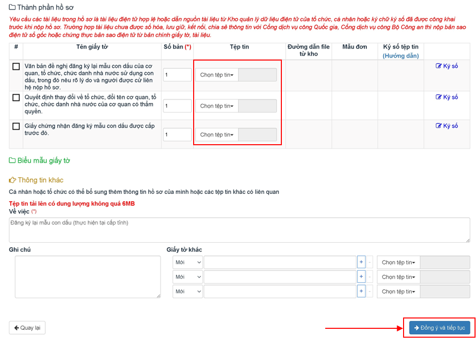- Bước 5: Thành phần hồ sơ: Chọn tệp tin (Scan file hoặc chọn tệp tin để tải lên) tương ứng với hồ sơ yêu cầu của thủ tục đăng ký mẫu dấu (dung lượng của mỗi tệp tin không quá 6 MB). Sau đó, chọn “Đồng ý và tiếp tục”. * Chú ý: Hồ sơ đăng ký con dấu thực hiện theo Nghị định số 99/2016/NĐ-CP ngày 01/7/2016 của Chính phủ về quản lý và sử dụng con dấu. Đối với các tài liệu thuộc danh mục bí mật nhà nước, không được phép đăng tải trên mạng internet thì đề nghị cơ quan, tổ chức cử cán bộ nộp hồ sơ trực tiếp tại Công an thành phố (qua Phòng Cảnh sát quản lý hành chính về trật tự xã hội).