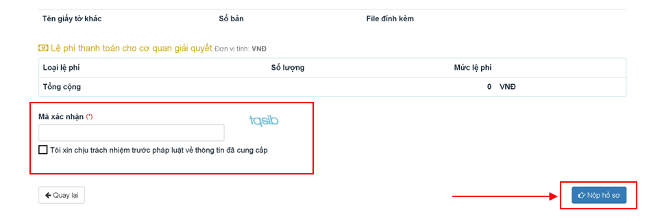 - Bước 6: Kiểm tra thông tin và nộp hồ sơ: Kiểm tra lại các thông tin đã cung cấp; nhập mã xác nhận (Captcha); chọn ô “Tôi xin chịu trách nhiệm trước pháp luật về thông tin đã cung cấp” và chọn “Nộp hồ sơ”.