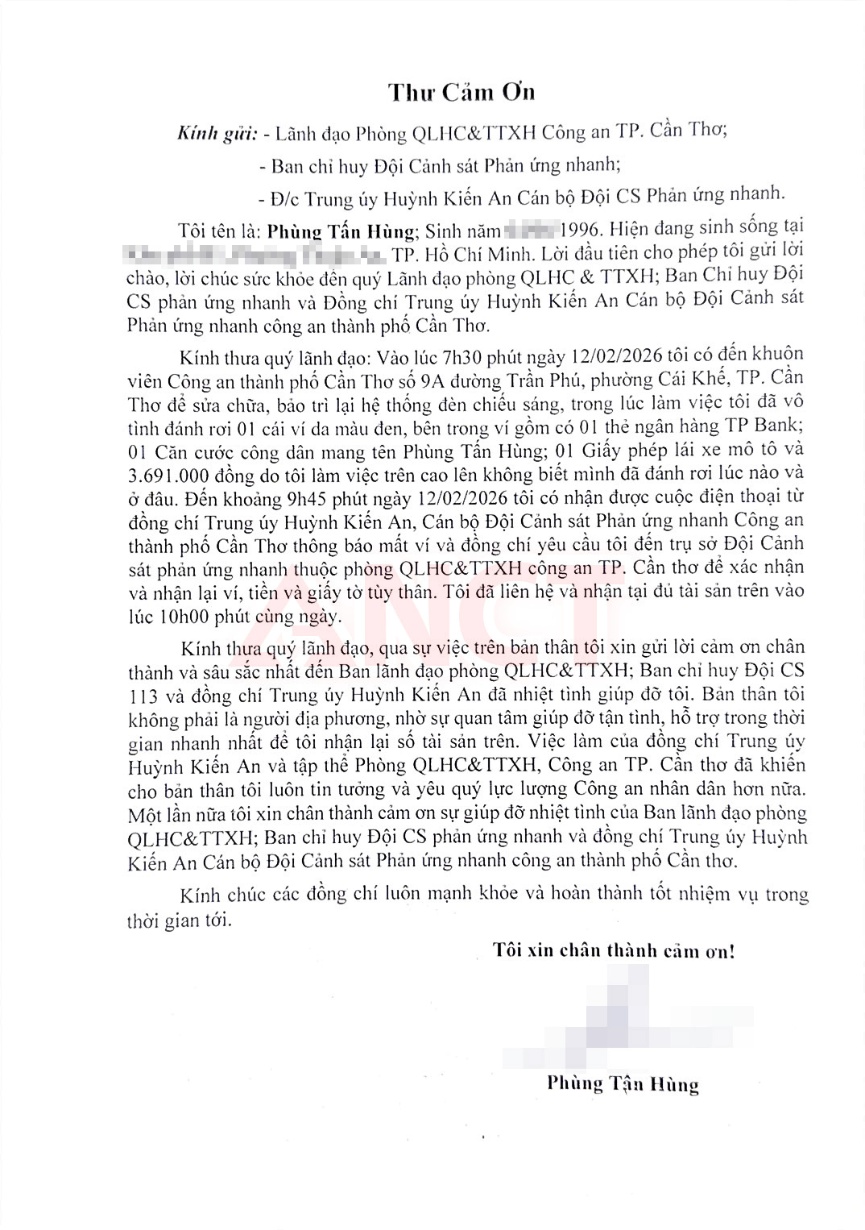 Chiếc ví sau đó được Trung úy Huỳnh Kiến An, cán bộ Đội Cảnh sát 113, Phòng Cảnh sát Quản lý hành chính về trật tự xã hội, Công an thành phố Cần Thơ phát hiện trong quá trình thực hiện nhiệm vụ. Ngay khi phát hiện, Trung úy Huỳnh Kiến An đã báo cáo lãnh đạo đơn vị, phối hợp xác minh thông tin và nhanh chóng liên hệ với chủ sở hữu để trao trả đầy đủ tài sản. Chỉ trong vài giờ cùng ngày, toàn bộ tiền mặt, giấy tờ và tài sản trong ví được trao trả lại cho anh Phùng Tấn Hùng. Không thiếu sót, không thất lạc, mọi thủ tục được thực hiện nhanh gọn, đúng quy định. Điều khiến câu chuyện không dừng lại ở một việc làm đúng chức trách chính là bức thư cảm ơn được anh Hùng gửi đến đơn vị sau đó. Trong thư, anh bày tỏ sự xúc động, gửi lời cảm ơn chân thành đến Ban lãnh đạo Phòng Cảnh sát Quản lý hành chính về trật tự xã hội, Ban Chỉ huy Đội Cảnh sát 113 và cá nhân Trung úy Huỳnh Kiến An vì tinh thần trách nhiệm, sự tận tình và thái độ hỗ trợ chu đáo.