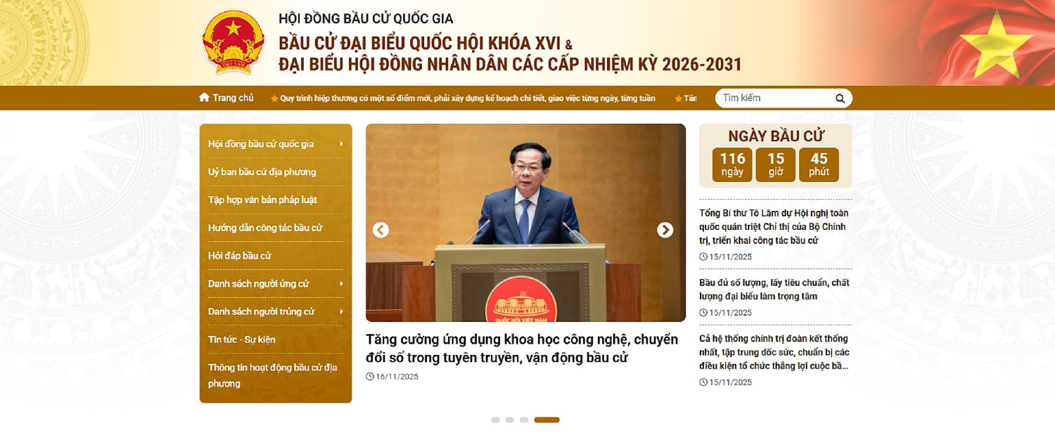 Nhằm giúp cử tri, Nhân dân truy cập, tìm kiếm, tiếp cận và nghiên cứu các thông tin về cuộc bầu cử đại biểu Quốc hội khóa XVI và đại biểu Hội đồng nhân dân các cấp nhiệm kỳ 2026-2031 (gọi tắt là cuộc bầu cử), từ ngày 10/11/2025, Trang thông tin điện tử về cuộc bầu cử đại biểu Quốc hội khóa XVI và đại biểu Hội đồng nhân dân các cấp nhiệm kỳ 2026-2031 đã chính thức được công bố.