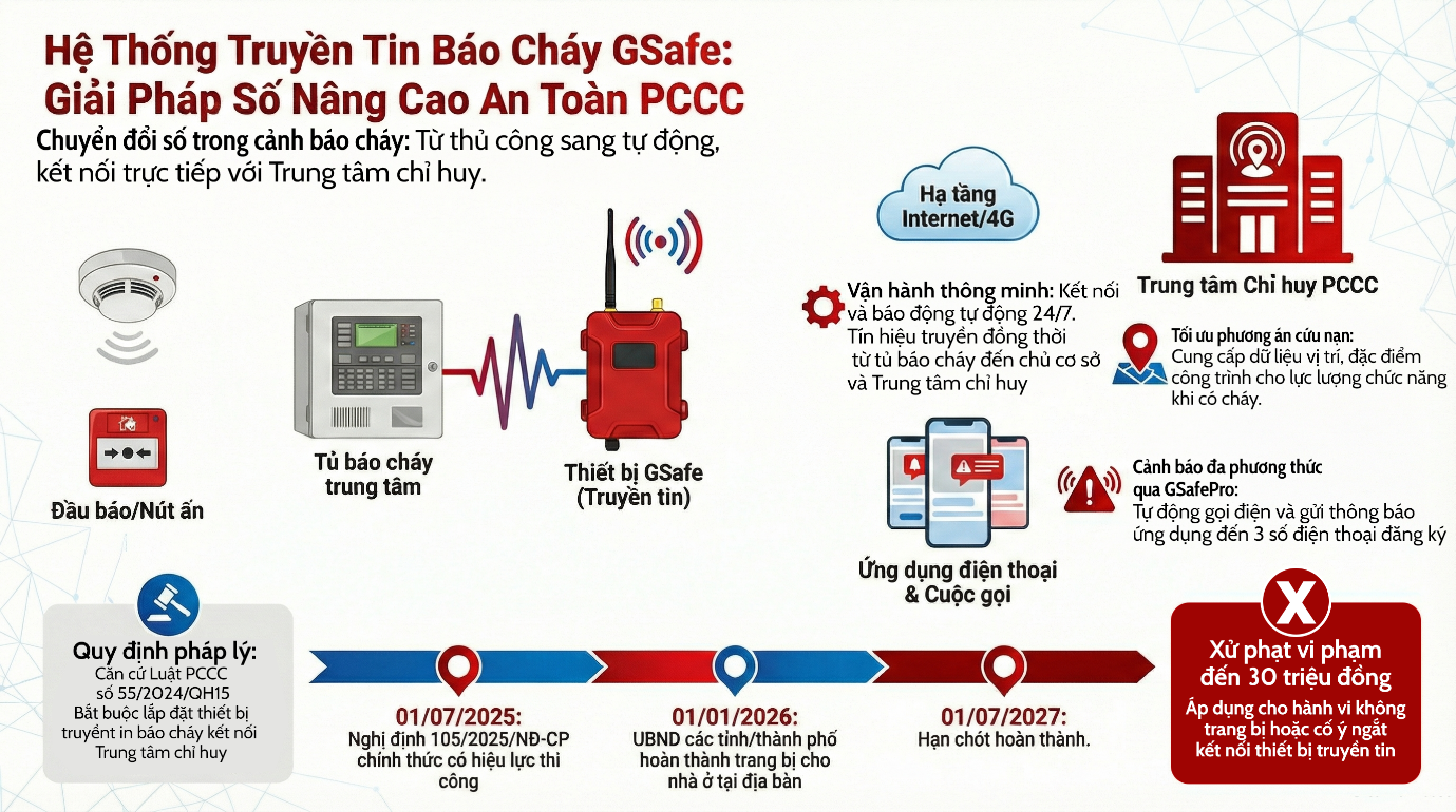Hệ thống truyền tin báo cháy GSafe là giải pháp công nghệ cho phép kết nối từ đầu báo cháy, nút ấn khẩn, tủ báo cháy trung tâm đến thiết bị truyền tin sử dụng hạ tầng Internet/4G, truyền tín hiệu tự động về Trung tâm Chỉ huy PCCC 24/7. Khi xảy ra sự cố, tín hiệu báo cháy được truyền đồng thời đến lực lượng chức năng và chủ cơ sở thông qua cuộc gọi và ứng dụng điện thoại (tối thiểu 03 số đăng ký), giúp rút ngắn tối đa thời gian tiếp nhận và xử lý thông tin.