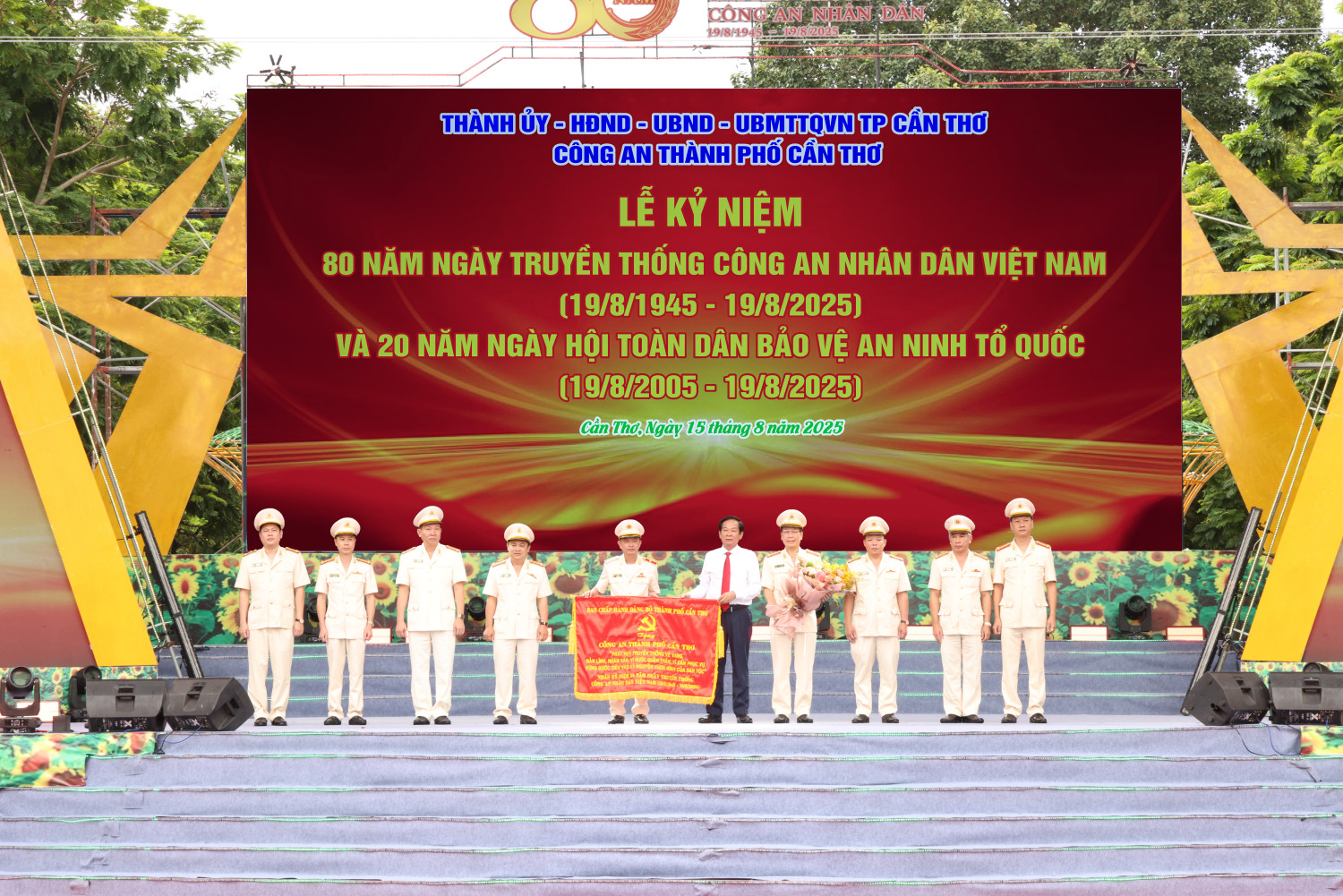 Đồng chí Đỗ Thanh Bình, Uỷ viên BCH TW Đảng, Bí thư Thành uỷ Cần Thơ (nay là Bộ trưởng Bộ Nội vụ) trao tặng bức trướng cho Công an TP Cần Thơ tại Lễ kỷ niệm 80 năm Ngày truyền thống Công an nhân dân (tháng 8/2025)