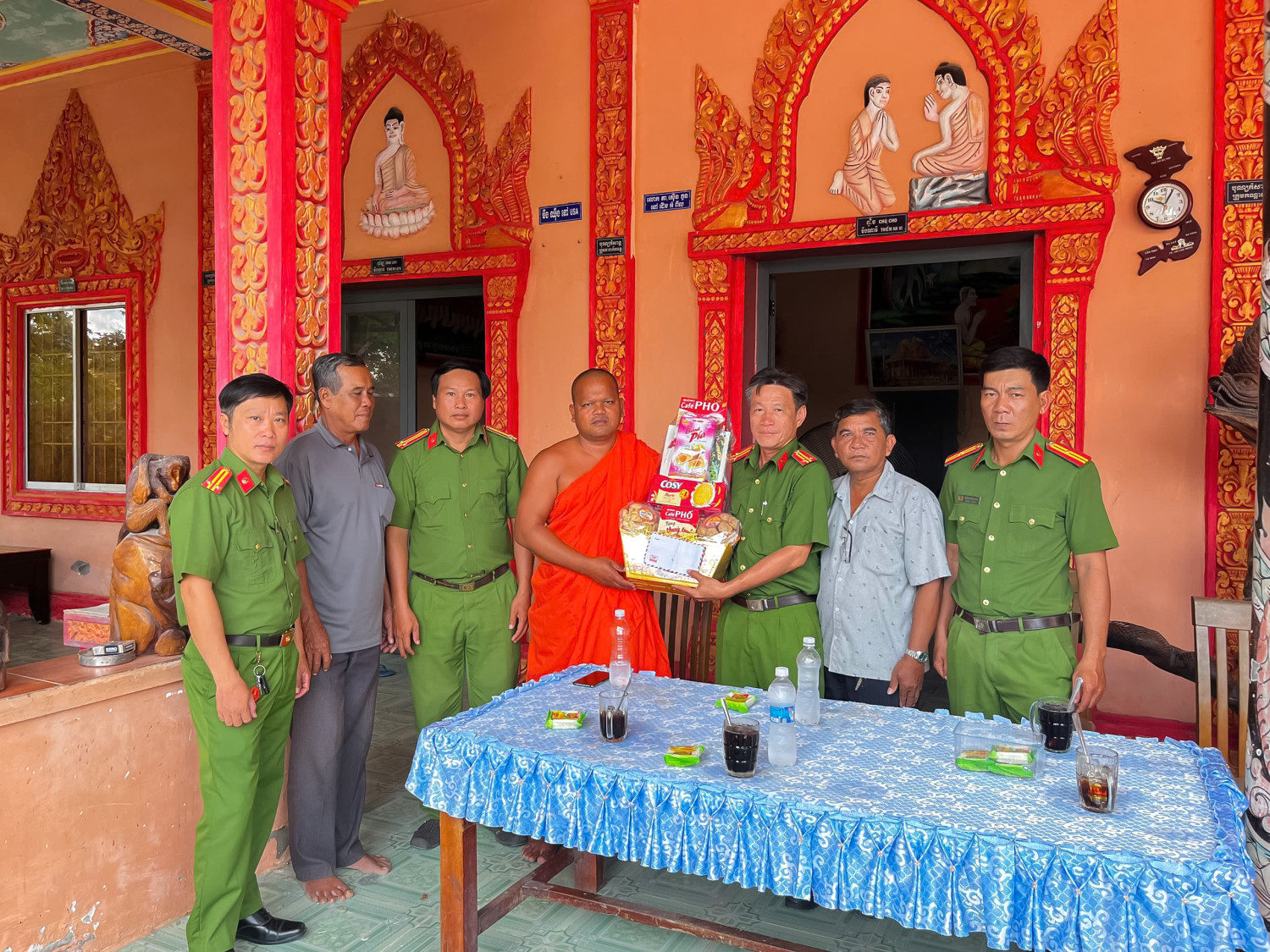 Trong không khí thân tình, đoàn công tác ghi nhận và biểu dương những đóng góp tích cực của các vị chức sắc, người có uy tín và đồng bào Khmer trong việc phối hợp cùng lực lượng Công an giữ gìn an ninh, trật tự trên địa bàn thời gian qua; đồng thời mong muốn tiếp tục nhận được sự đồng hành, ủng hộ trong công tác bảo đảm an ninh, trật tự tại địa phương.