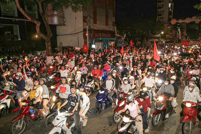 Người dân xuống đường tại trung tâm thành phố Cần Thơ để ăn mừng chiến thắng của đội tuyển U22 Việt Nam