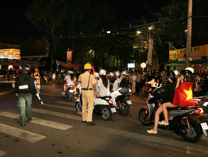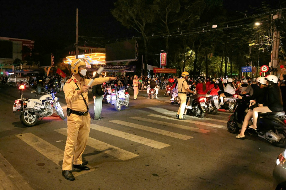 Thực hiện ý kiến chỉ đạo của lãnh đạo Công an thành phố, Công an các đơn vị, Công an các xã, phường đã huy động tối đa lực lượng, phương tiện, biện pháp đảm bảo an ninh trật tự, trật tự an toàn giao thông trên các tuyến đường và khu vực trọng điểm, nhất là thời điểm sau trận chung kết. Tổ chức hướng dẫn, phân luồng, điều tiết, không để xảy ra tình trạng ùn tắc giao thông; tuyệt đối không để xảy ra đua xe trái phép, nhất là tại các khu vực công cộng, trung tâm, các tuyến đường trọng điểm. Đồng thời, tuyên truyền, nhắc nhở người dân tham gia cổ vũ và thể hiện tình yêu bóng đá một cách văn minh, văn hóa và an toàn, nghiêm chỉnh chấp hành luật giao thông, tránh ùn tắc và tai nạn giao thông.