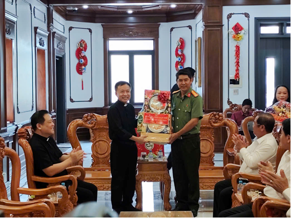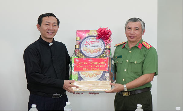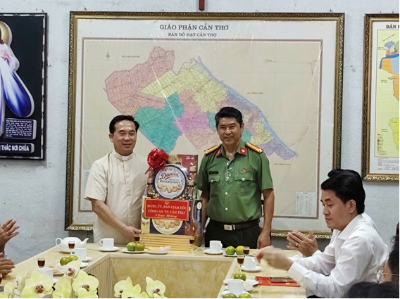 Thượng tá Nguyễn Hoàng Lâm, Phó Trưởng Phòng An ninh nội địa thăm, tặng quà, chúc mừng lễ Phục sinh tại Tòa Giám mục Cần Thơ, phường Ninh Kiều, thành phố Cần Thơ