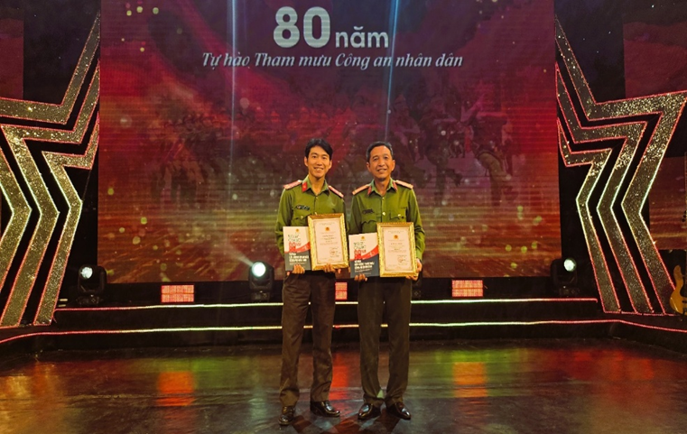 Trung tá Trần Thanh Thủy và Đại úy Hồ Công Quang, cán bộ phòng Công tác chính trị, Công an thành phố Cần Thơ vinh dự nhận Giải C và Giải Chuyên đề