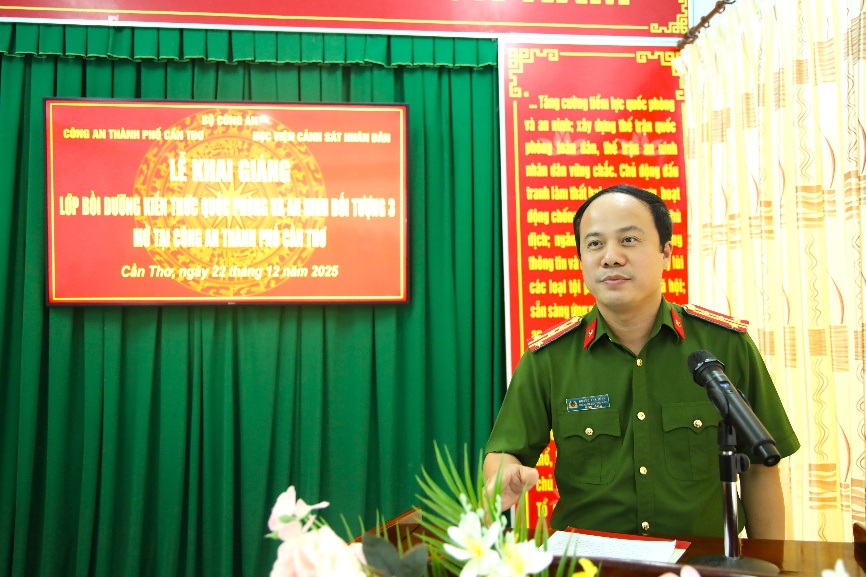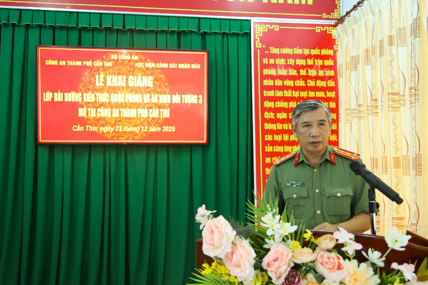 Chiều 22-12, Học viện Cảnh sát nhân dân (CSND) phối hợp Công an TP Cần Thơ tổ chức Lễ Khai giảng lớp bồi dưỡng kiến thức quốc phòng và an ninh đối tượng 3 mở tại Công an TP Cần Thơ, dự Lễ khai giảng có Đại tá PGS.TS Hoàng Anh Tuấn, Phó Giám đốc Học viện CSND, Đại tá Huỳnh Hoài Hận, Phó Giám đốc Công an TP Cần Thơ và đại diện các khoa, phòng cùng 88 học viên tham gia lớp bồi dưỡng.
