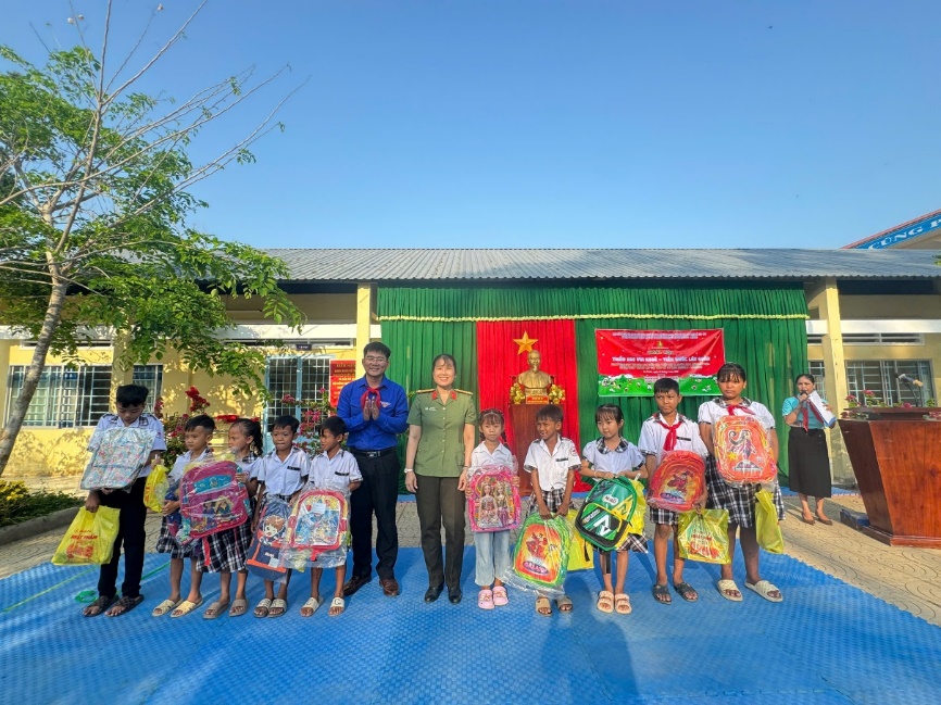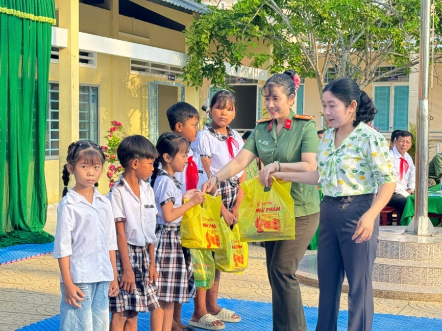 Đồng chí Thượng tá Lưu Thị Nga - Phó trưởng Phòng Tổ chức cán bộ trao quà cho học sinh nghèo có hoàn cảnh khó khăn tại Trường Xà Phiên 3