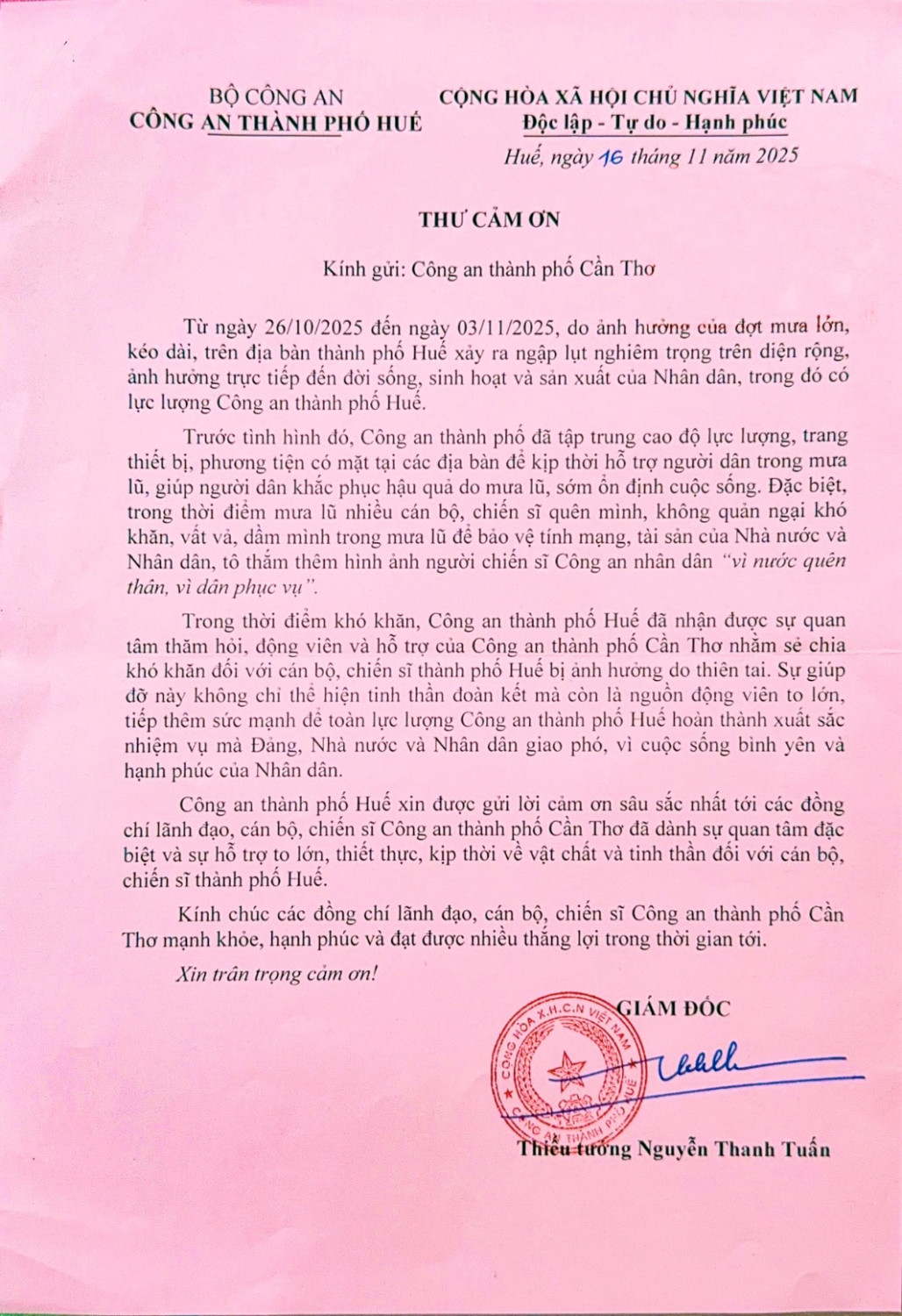 Ngày 27/11/2025, Công an TP Cần Thơ đã nhận được thư cảm ơn từ Giám đốc Công an TP Huế, bày tỏ sự trân trọng và xúc động trước sự quan tâm, động viên và hỗ trợ kịp thời mà Công an TP Cần Thơ đã dành cho cán bộ, chiến sĩ Công an TP Huế bị ảnh hưởng bởi đợt thiên tai vừa qua.