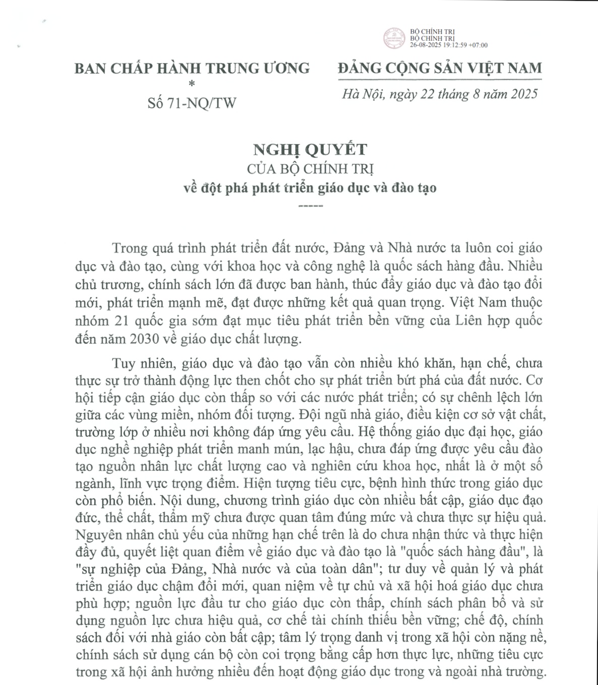 Nghị quyết số 71-NQ/TW, ngày 22/8/2025 của Bộ Chính trị về đột phá phát triển giáo dục và đào tạo