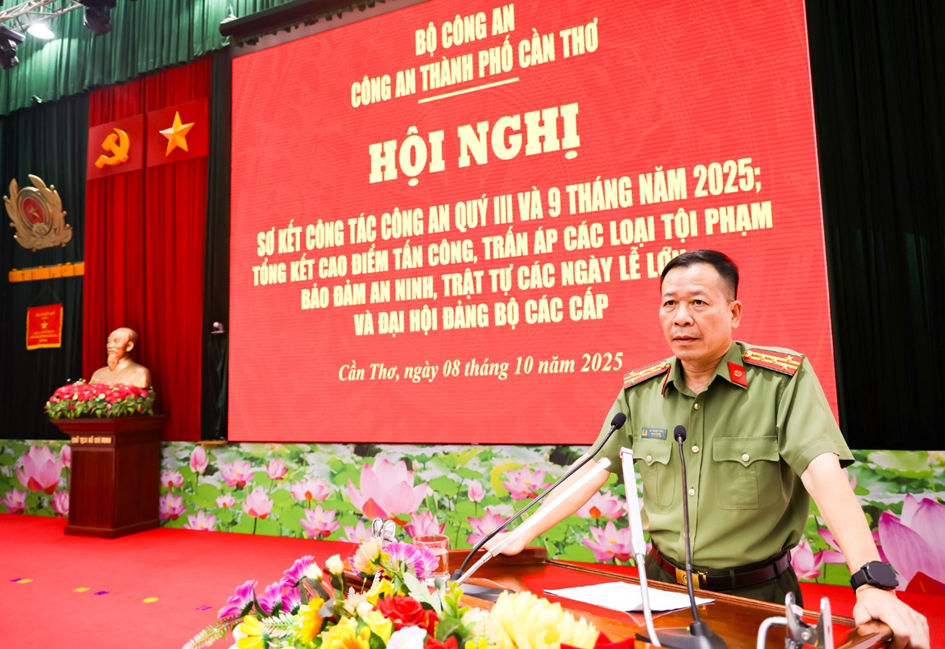 Ngày 08/10/2025, Công an thành phố Cần Thơ sơ kết công tác công an quý III và 9 tháng đấu năm 2025; tổng kết Cao điểm tấn công, trấn áp các loại tội phạm bảo đảm ANTT các ngày lễ lớn và Đại hội đảng bộ các cấp
