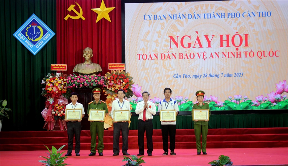 Đồng chí Đồng Văn Thanh - Chủ tịch Hội đồng nhân dân thành phố Cần Thơ trao Bằng khen của Ủy ban nhân dân thành phố Cần Thơ tặng tập thể, cá nhân có thành tích xuất sắc trong phong trào Toàn dân bảo vệ an ninh Tổ quốc
