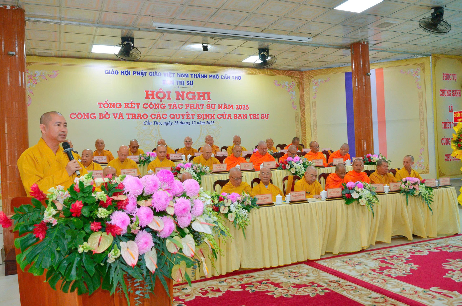 Trong không khí đoàn kết và hòa hợp của Tăng, Ni, Phật tử toàn thành phố, Ban Trị sự Giáo hội Phật giáo Việt Nam thành phố Cần Thơ đã long trọng tổ chức Hội nghị tổng kết công tác Phật sự năm 2025, đồng thời công bố và trao các quyết định quan trọng của Ban Trị sự nhiệm kỳ mới. Tham dự Hội nghị có đại diện lãnh đạo Hội đồng chứng minh, Hội đồng Trị sự Giáo hội Phật giáo Việt Nam; lãnh đạo các sở, ban, ngànhthành phố; đại diện chính quyền địa phương; cùng thành viên Ban Trị sự Giáo hội Phật giáo Việt Nam thành phố Cần Thơ và trụ trì các cơ sở tự viện trên địa bàn thành phố. Tại Hội nghị, Ban Trị sự Giáo hội Phật giáo Việt Nam thành phố Cần Thơ đã báo cáo tổng kết công tác Phật sự năm 2025, đánh giá toàn diện những mặt đạt được, những khó khăn, hạn chế và đề ra phương hướng, nhiệm vụ trọng tâm trong năm 2026. Báo cáo khẳng định, trong năm qua, hoạt động Phật sự trên địa bàn thành phố tiếp tục diễn ra ổn định, đúng theo Hiến chương Giáo hội Phật giáo Việt Nam, tuân thủ pháp luật của Nhà nước; tinh thần đoàn kết, hòa hợp trong nội bộ Giáo hội được giữ vững; các tự viện, Tăng, Ni, Phật tử tích cực tham gia các phong trào thi đua yêu nước nhất là phong trào “Toàn dân bảo vệ an ninh Tổ quốc”; hoạt động an sinh xã hội, từ thiện nhân đạo, góp phần xây dựng khối đại đoàn kết toàn dân tộc, đồng hành cùng chính quyền địa phương trong phát triển kinh tế - xã hội, chăm lo đời sống Nhân dân. Hội nghị cũng đã công bố và trao các quyết định của Ban Trị sự Giáo hội Phật giáo Việt Nam thành phố Cần Thơ liên quan đến công tác nhân sự, phân công, kiện toàn tổ chức bộ máy Giáo hội các cấp, đáp ứng yêu cầu Phật sự trong giai đoạn mới. Việc công bố, trao quyết định được thực hiện trang trọng, đúng quy định, thể hiện sự thống nhất, dân chủ, công khai trong sinh hoạt Giáo hội, tạo niềm tin và sự đồng thuận cao trong Tăng, Ni, Phật tử.
