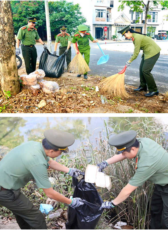 Cán bộ, chiến sĩ Công an thành phố thu gom rác thải, dọn dẹp vệ sinh môi trường
