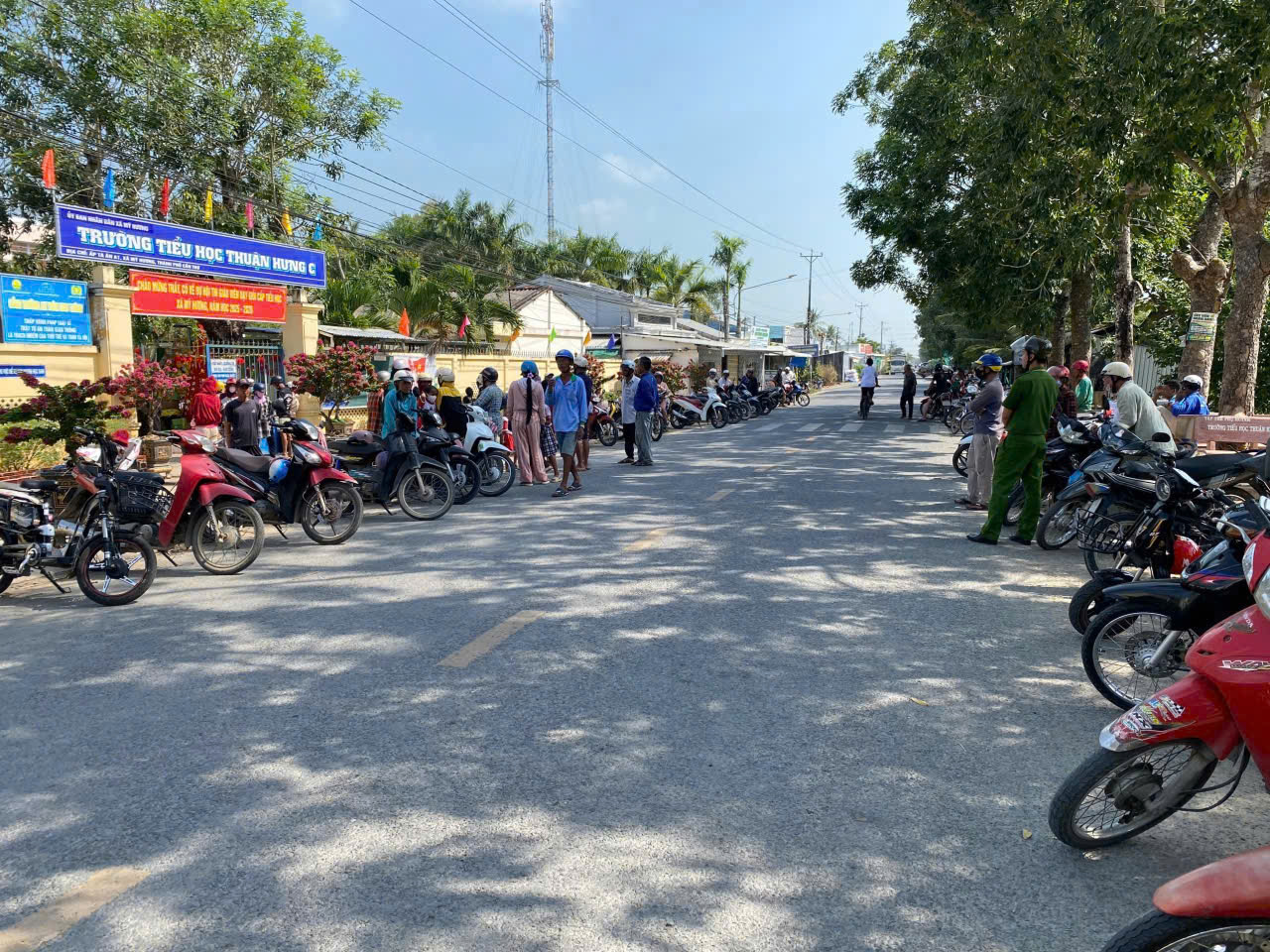 Công an xã Mỹ Hương tuyên truyền pháp luật đến phụ huynh tại thời điểm tan trường